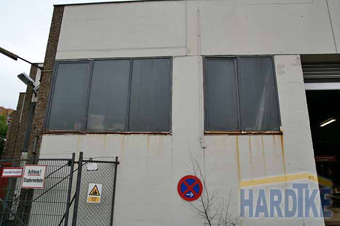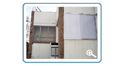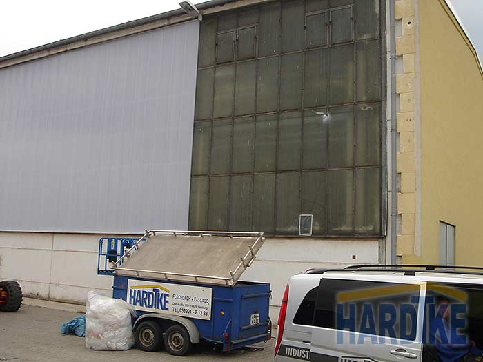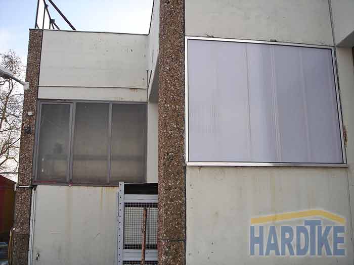 Sanierung Glasfassade Austausch der Drahtglasscheiben durch Polycarbonat-Paneele im Aluminium-Rahmen, inkl. Klappen |